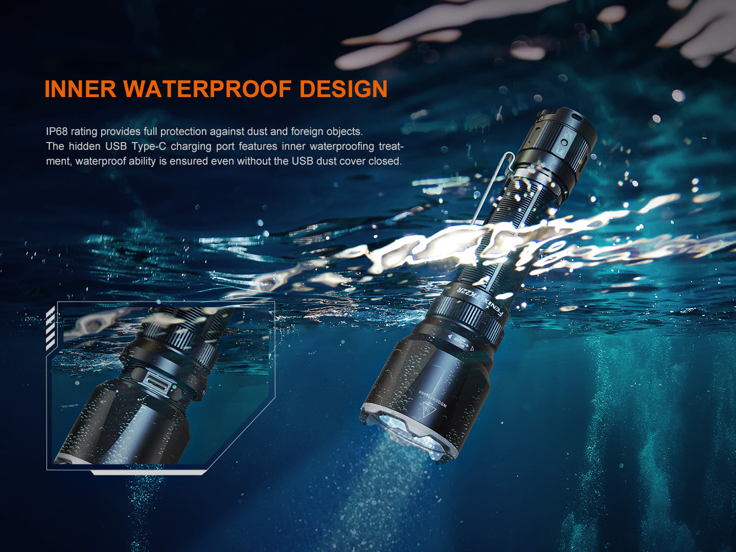 The Fenix TK22R features a 3200 lumen maximum output, seamless transition between tactical and duty modes, and the Patented Flexi-sensa Control Switch for intuitive operation. Its hidden USB-C charging port ensures swift recharging, complemented by the robust 5000mAh included battery. This flashlight boasts durability with tungsten steel alloy striking tips and double springs, optimized for tactical use. Innovative APF technology ensures consistent brightness, while intelligent overheat protection keeps performance optimal. Even with its charging port exposed, its resilience shines through, maintaining a waterproof rating of IP68.